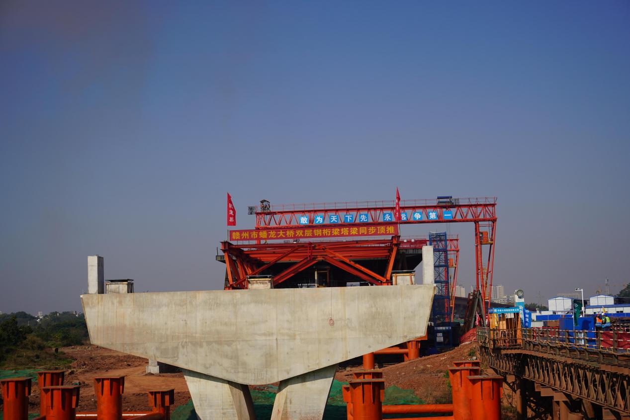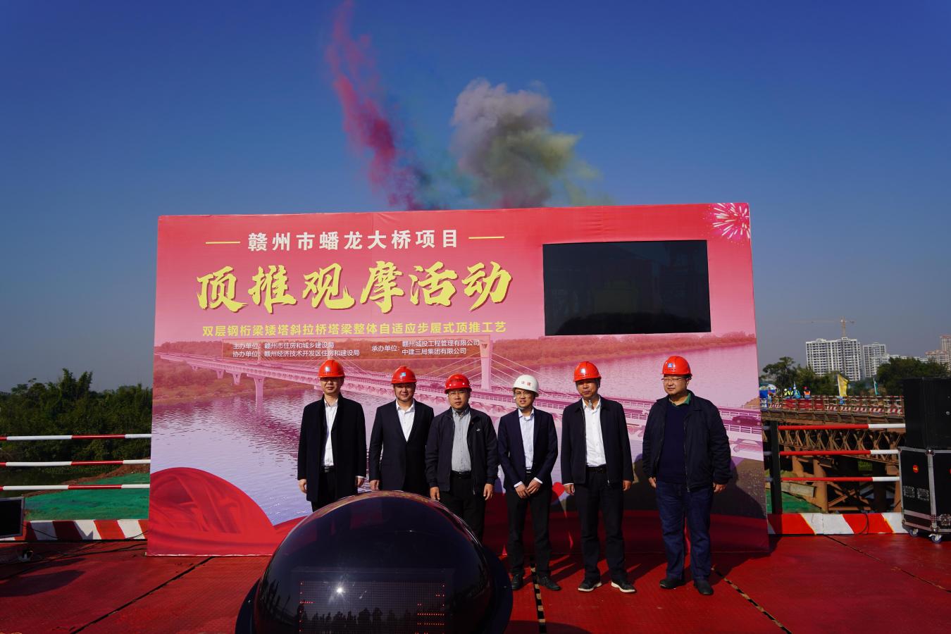 12月6日,贛州市蟠龍大橋項目主橋鋼結(jié)構(gòu)首次頂推啟動,為主橋的順利推進(jìn)打下堅實基礎(chǔ),標(biāo)志著該項目取得了全市重點項目建設(shè)百日攻堅活動任務(wù)目標(biāo)的節(jié)點性勝利。贛州經(jīng)濟技術(shù)開發(fā)區(qū)住房和建設(shè)局,贛州城投工程管理公司、中建三局總承包公司等參建各單位代表共計60余人參加頂推啟動活動。