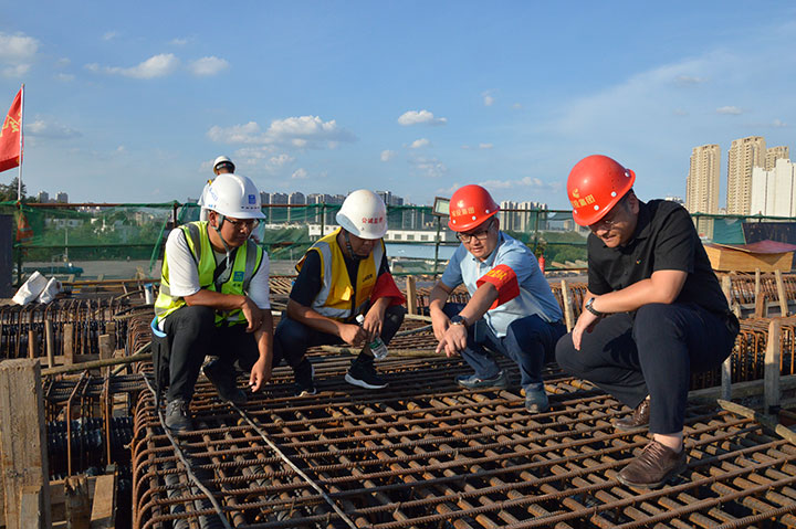 蟠龍大橋項目橋梁工程全長1376米,由南北引橋工程和主橋工程組成,其中引橋工程有九聯(lián)預(yù)應(yīng)力現(xiàn)澆箱梁(980米),主橋工程有一聯(lián)單索面三塔雙層鋼桁梁(396米),本次首聯(lián)現(xiàn)澆箱梁橋面寬16.5米、高度2米、混凝土用量1593方,施工采用盤扣式滿堂支架技術(shù)措施。據(jù)悉,考慮到本次混凝土澆筑方量大、體積大、砼標(biāo)號高、高溫氣候等技術(shù)因素及支模架危險性較大工程等安全因素,臨時黨支部充分運用學(xué)習(xí)交流、溝通協(xié)調(diào)機制,積極組織參建各方對支模架安全技術(shù)方案進行了專家論證評審,確保施工安全可靠、技術(shù)可行,并提前到商品混凝土攪拌站開展溝通協(xié)調(diào),掌握原材料質(zhì)量及倉庫儲備數(shù)量,提前做好夜間值班分工、后勤保障服務(wù)工作,確保箱梁澆筑順利完成。