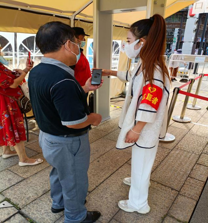 土地置業(yè)公司的志愿者在江南宋城歷史文化旅游區(qū)值班值守,引導廣大游客疫情期間掃碼入場,積極佩戴口罩,做好安全旅游防護措施。