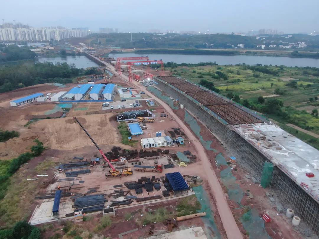 在蟠龍大橋項目,累計完成總工程量的35%,樁基、墩柱全部完成,蓋梁完成66.7%,主橋鋼結(jié)構(gòu)完成48%。