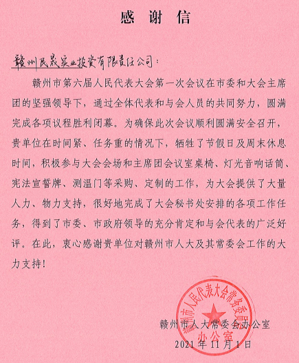 這次圓滿完成市“兩會(huì)”會(huì)務(wù)保障工作,并獲得市人大、市政協(xié)感謝信表揚(yáng),是對(duì)集團(tuán)上下講政治、講擔(dān)當(dāng)、講大局的認(rèn)可與褒獎(jiǎng)。第三屆世界贛商大會(huì)召開在即,大會(huì)開幕式將在贛州大劇院舉辦,民晟實(shí)業(yè)公司等相關(guān)單位將再接再厲,熱情服務(wù)好各界賓朋,充分展示新時(shí)代國(guó)企的擔(dān)當(dāng)作為。