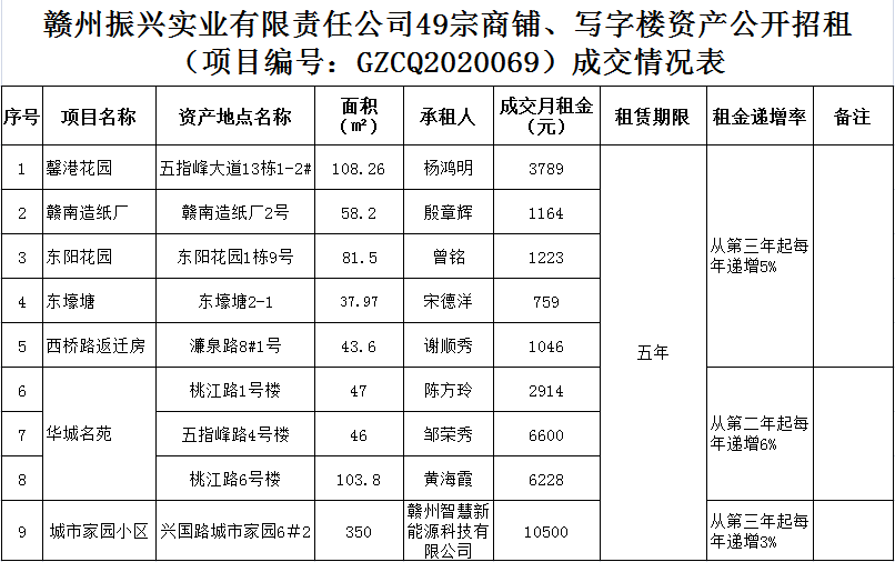 2020年10月27日上午10時(shí),在贛州市公共資源交易中心舉行的贛州振興實(shí)業(yè)有限責(zé)任公司49宗商鋪、寫字樓資產(chǎn)公開(kāi)招租(項(xiàng)目編號(hào):GZCQ2020069),現(xiàn)將公開(kāi)招租成交情況公示如下: