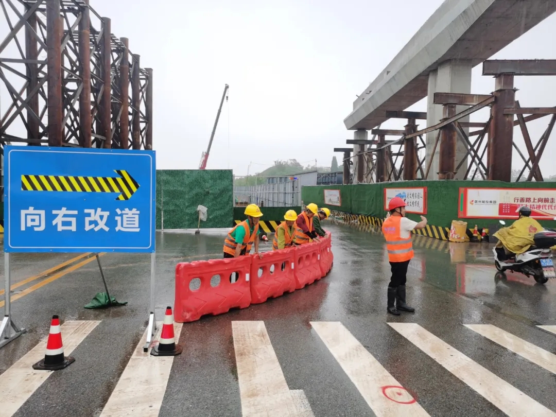 交通安全維護(hù)是項(xiàng)目施工的重中之重。為在確保施工安全和進(jìn)度的前提下,最大限度減少項(xiàng)目建設(shè)對(duì)交通的影響,贛州城投集團(tuán)項(xiàng)目部工作人員迅速行動(dòng),召集施工、監(jiān)理等單位討論編制創(chuàng)業(yè)路橋梁上跨崗邊大道的交通導(dǎo)行方案。為保證交通導(dǎo)行方案的可行性,項(xiàng)目部邀請(qǐng)交警部門、龍泉村村民到現(xiàn)場(chǎng)踏勘,聽(tīng)取意見(jiàn)、建議,并對(duì)方案進(jìn)一步優(yōu)化、完善。經(jīng)交警部門審批方案通過(guò)后,項(xiàng)目部集中力量抓住4月10日和11日周末兩天的空檔期,加班加點(diǎn)完成了跨崗邊大道區(qū)域的交通導(dǎo)行及圍擋,并在后續(xù)施工中安排了專人對(duì)車輛、行人進(jìn)行引導(dǎo),對(duì)隱患及時(shí)排查整改,派駐安全引導(dǎo)員在學(xué)生上下課時(shí)間點(diǎn)到路口對(duì)通行車輛、行人進(jìn)行引導(dǎo),護(hù)航創(chuàng)業(yè)路三標(biāo)上跨崗邊大道橋梁施工階段的原有地面道路社會(huì)車輛及行人有序通行。